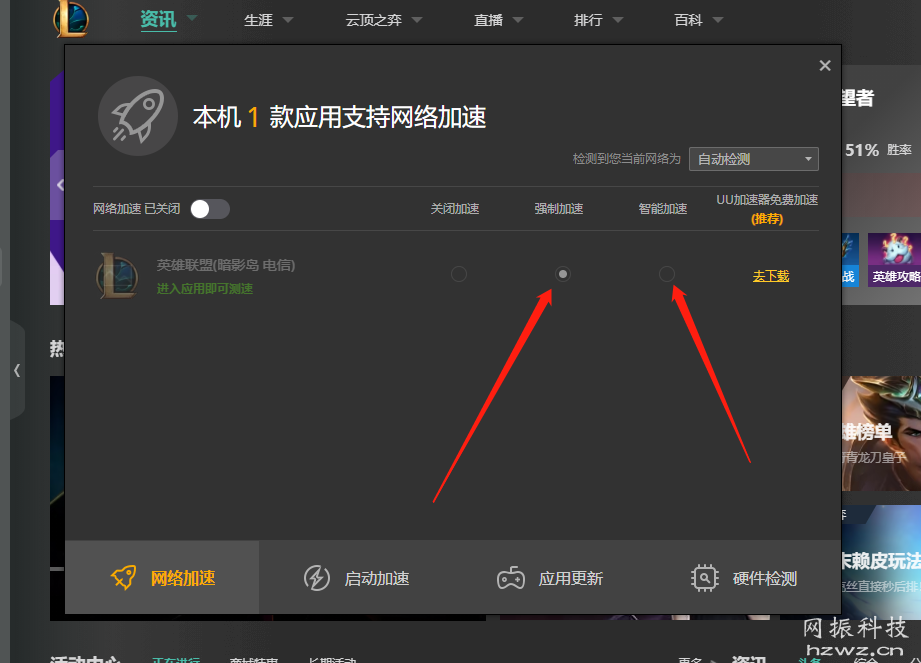 WeGame提供了3種方式。如果默認是關閉加速。那么就選智能加速或強制加速,如果默認已經(jīng)是智能或者強制了。那么就選關加速。